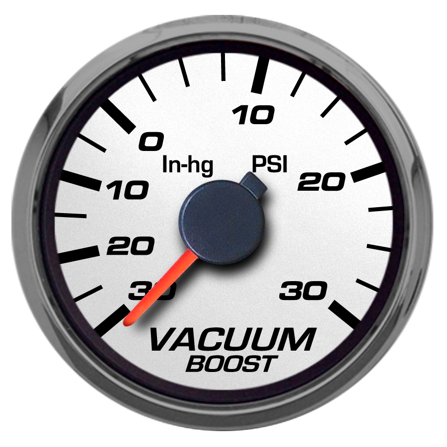 Performance II Series instruments have the combined style of European sports car and racing gauges. This performance look has a classic gauge feel without the "in-your-face" look of a racing gauge. Full sweep stepper motors for higher dial resolution and blue LED back lighting at night. Titanium bezels and flat glass add to the high class, OE installed look. Just like always, NVU does not have any logos on the dial so the final result will be a professional, custom look. GEN II vacuum-boost gauges are fully electronic, no tubing to kink or break! Simply install the compact MAP transducer and wire it up, makes for a very clean installation. Kit includes gauge, spin-on back clamp, VAC/BOOST transducer (1/8-27 thread) and detailed instructions.