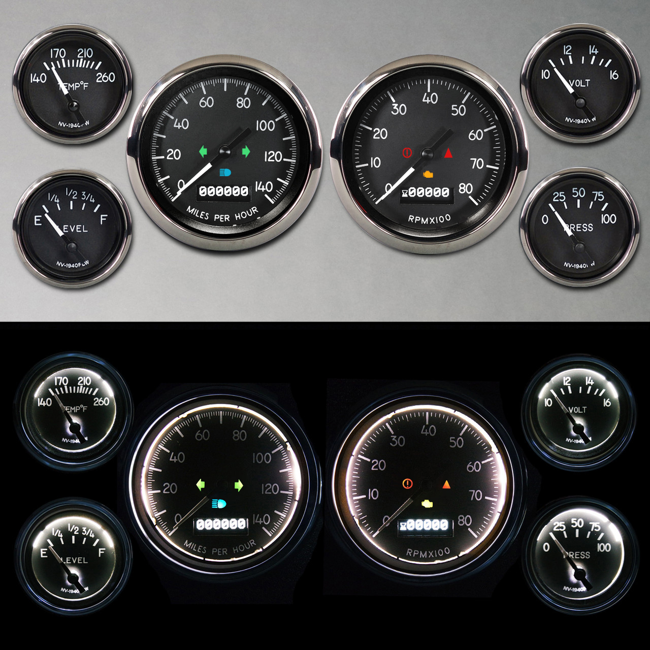 STYLE: Inspired by military sets, we have duplicated the feel of the very popular aircraft and military gauges of the 30s and 40s, but with modern technology. Why buy salvage yard gauges that don’t match, or work for that matter? We started with the military graphics and upgraded to domed lenses and stainless steel bezels for an upscale, “5-Star General” appearance. The graphics are duplicated down to the smallest detail, and a white-tipped pointer adds to the effect.