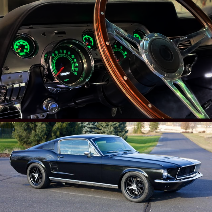 1967 1968 Mustang gauges and aftermarket kits from New Vintage USA offer the widest selection on the market. With several styles and colors you are sure to find something that suits your build. Choose from the factory-inspired 67 series, or go all-in with the CFR Series. Kits are available in DIY (Do It Yourself), Assembled and wired, LED backlit or old-school incandescent perimeter lit. Pre-wired Kits save on installation time by including a new bezel in your choice of finished (camera case black, woodgrain or aluminum) with gauges installed and pre-wired to a pigtail plug and harness that can be spliced into your factory or aftermarket harness (not plug-and play). Includes electronic speedometer, tachometer, oil pressure, water temperature, factory match fuel gauge (73-10 ohm, no sender included use existing sender), temperature and pressure senders with bushing kit, ABS mounting panel, installed polycarbonate top support, reproduction bezel, and instructions. Stepper motor kits have LED backlit dials and pointers, full sweep minor gauges and dampened factory match pre-set fuel gauge.