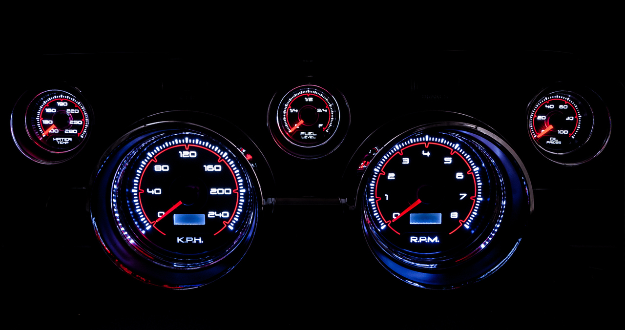1967 1968 Mustang gauges and aftermarket kits from New Vintage USA offer the widest selection on the market. With several styles and colors you are sure to find something that suits your build. Choose from the factory-inspired 67 series, or go all-in with the CFR Series. Kits are available in DIY (Do It Yourself), Assembled and wired, LED backlit or old-school incandescent perimeter lit. Pre-wired Kits save on installation time by including a new bezel in your choice of finished (camera case black, woodgrain or aluminum) with gauges installed and pre-wired to a pigtail plug and harness that can be spliced into your factory or aftermarket harness (not plug-and play). Includes electronic speedometer, tachometer, oil pressure, water temperature, factory match fuel gauge (73-10 ohm, no sender included use existing sender), temperature and pressure senders with bushing kit, ABS mounting panel, installed polycarbonate top support, reproduction bezel, and instructions. Stepper motor kits have LED backlit dials and pointers, full sweep minor gauges and dampened factory match pre-set fuel gauge.