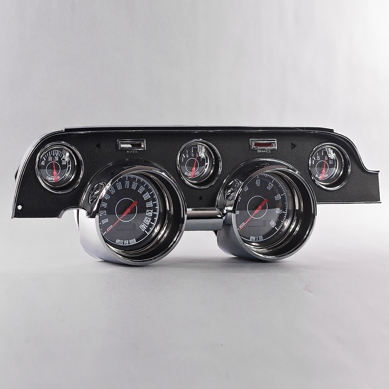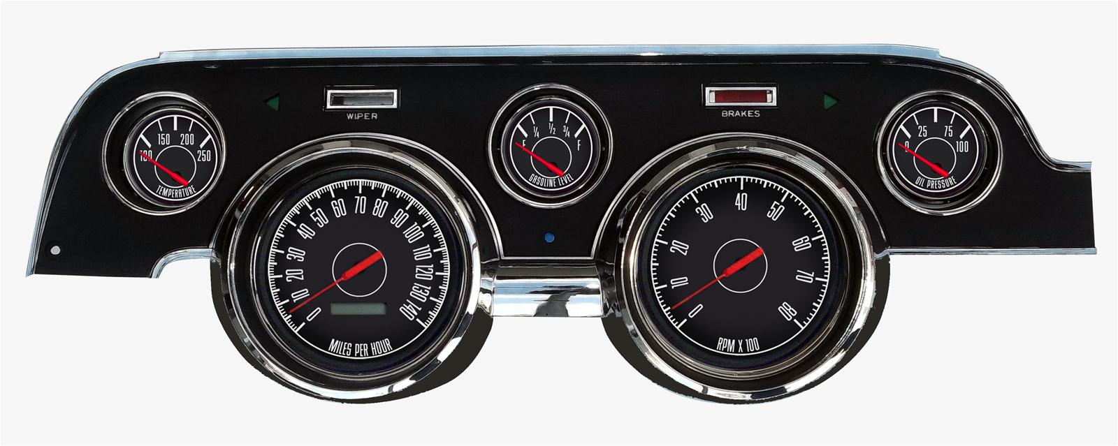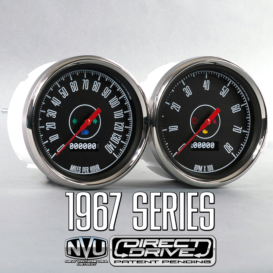 1967 1968 Mustang gauges and aftermarket kits from New Vintage USA offer the widest selection on the market. With several styles and colors you are sure to find something that suits your build. Choose from the factory-inspired 67 series, or go all-in with the CFR Series. Kits are available in DIY (Do It Yourself), Assembled and wired, LED backlit or old-school incandescent perimeter lit. Pre-wired Kits save on installation time by including a new bezel in your choice of finished (camera case black, woodgrain or aluminum) with gauges installed and pre-wired to a pigtail plug and harness that can be spliced into your factory or aftermarket harness (not plug-and play). Includes electronic speedometer, tachometer, oil pressure, water temperature, factory match fuel gauge (73-10 ohm, no sender included use existing sender), temperature and pressure senders with bushing kit, ABS mounting panel, installed polycarbonate top support, reproduction bezel, and instructions. Stepper motor kits have LED backlit dials and pointers, full sweep minor gauges and dampened factory match pre-set fuel gauge.
