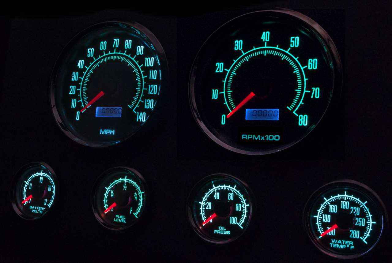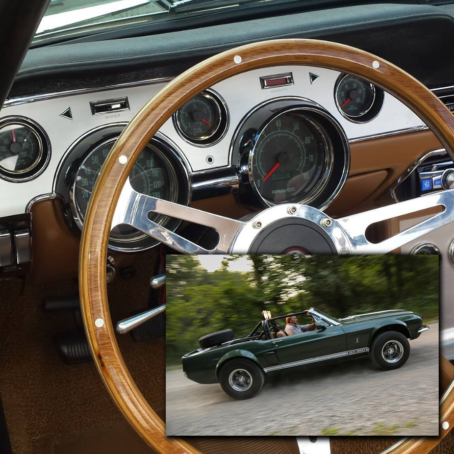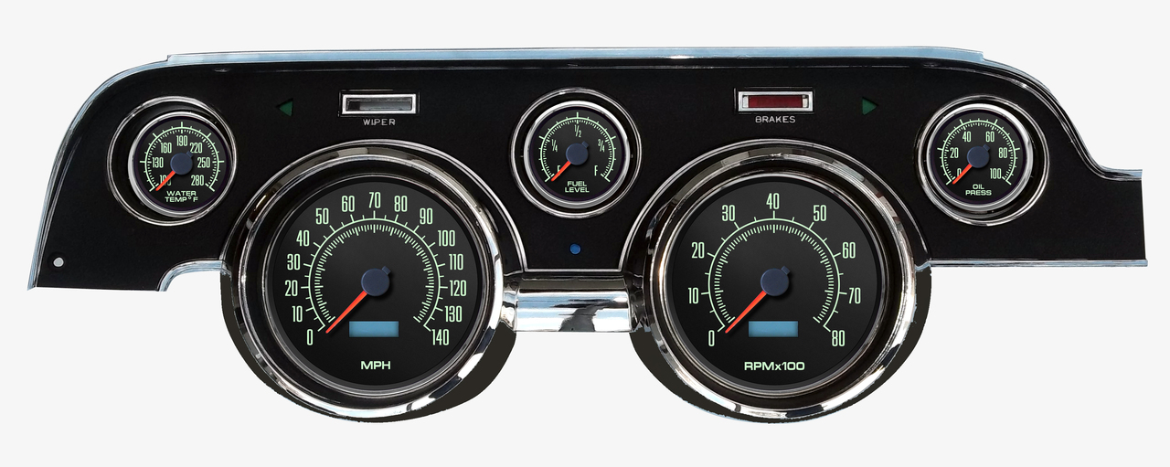 1967 1968 Mustang gauges and aftermarket kits from New Vintage USA offer the widest selection on the market. With several styles and colors you are sure to find something that suits your build. Choose from the factory-inspired 67 series, or go all-in with the CFR Series. Kits are available in DIY (Do It Yourself), Assembled and wired, LED backlit or old-school incandescent perimeter lit. Pre-wired Kits save on installation time by including a new bezel in your choice of finished (camera case black, woodgrain or aluminum) with gauges installed and pre-wired to a pigtail plug and harness that can be spliced into your factory or aftermarket harness (not plug-and play). Includes electronic speedometer, tachometer, oil pressure, water temperature, factory match fuel gauge (73-10 ohm, no sender included use existing sender), temperature and pressure senders with bushing kit, ABS mounting panel, installed polycarbonate top support, reproduction bezel, and instructions. Stepper motor kits have LED backlit dials and pointers, full sweep minor gauges and dampened factory match pre-set fuel gauge.