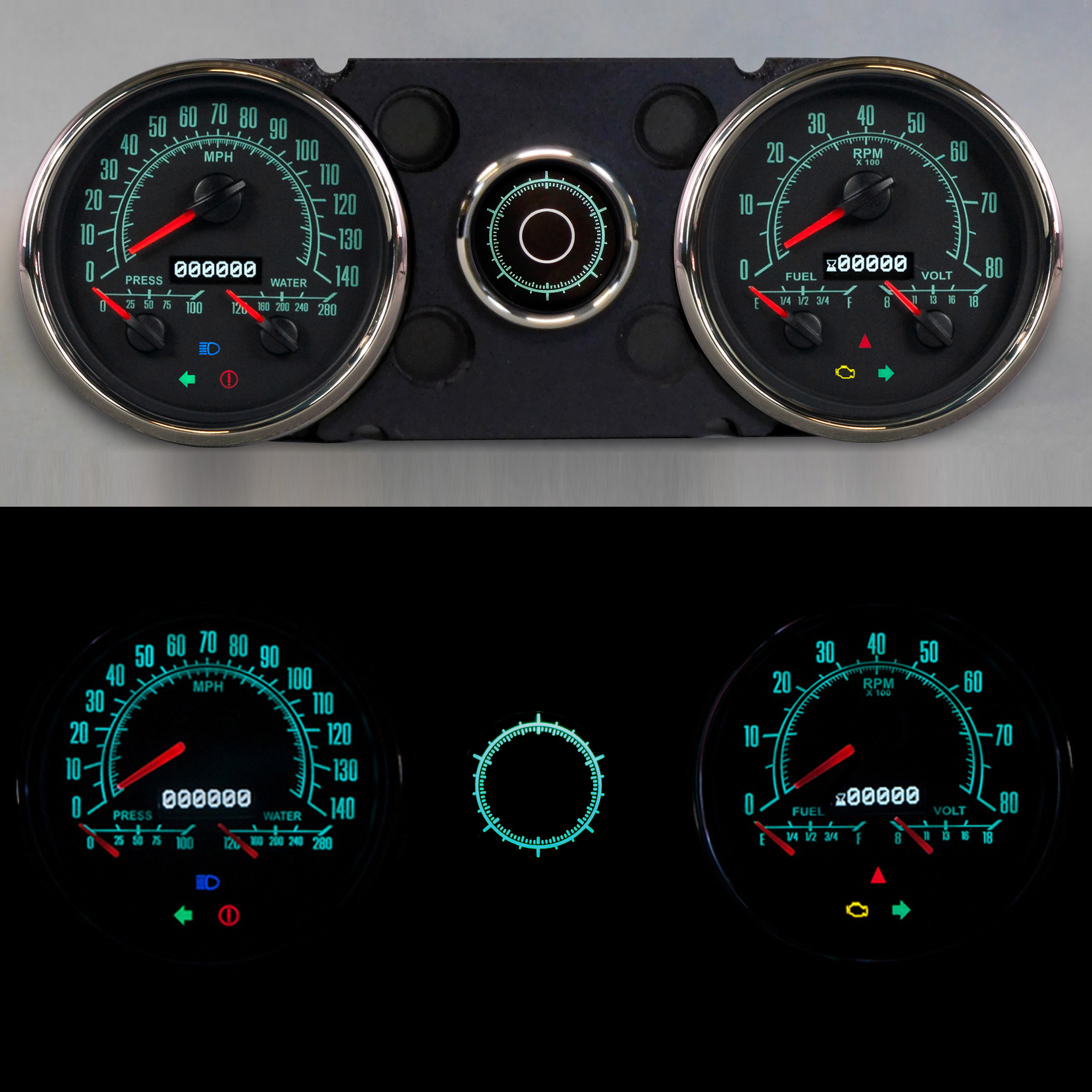 NVU 1969 SERIES are the original backlit muscle car-themed instruments. Bold 60s mint green graphics on a black background with backlit red pointers topped with real glass lenses and hand polished stainless-steel bezels. Great for any restoration, resto-mod or build where modern technology and vintage appearance is a must. Perfect for any 60s, 70s, muscle car, gasser, pro-touring dash gauges.