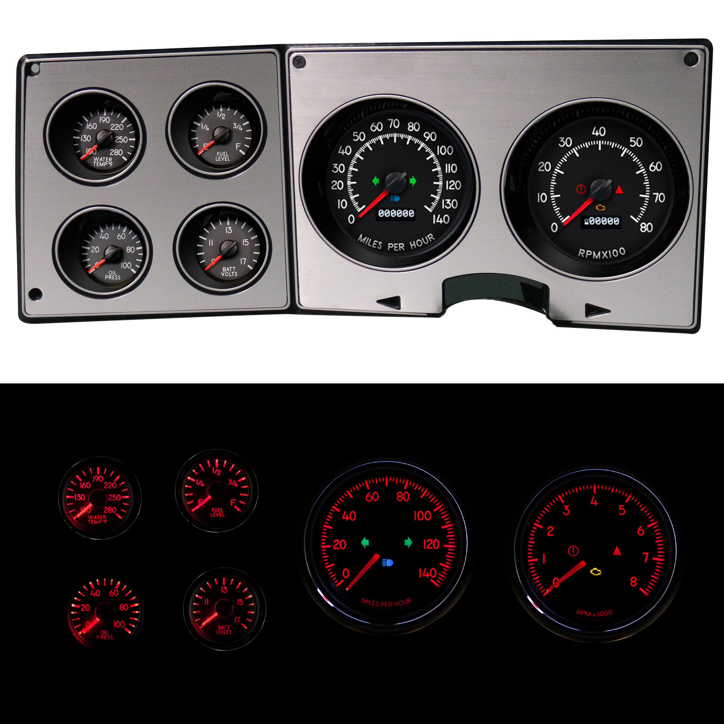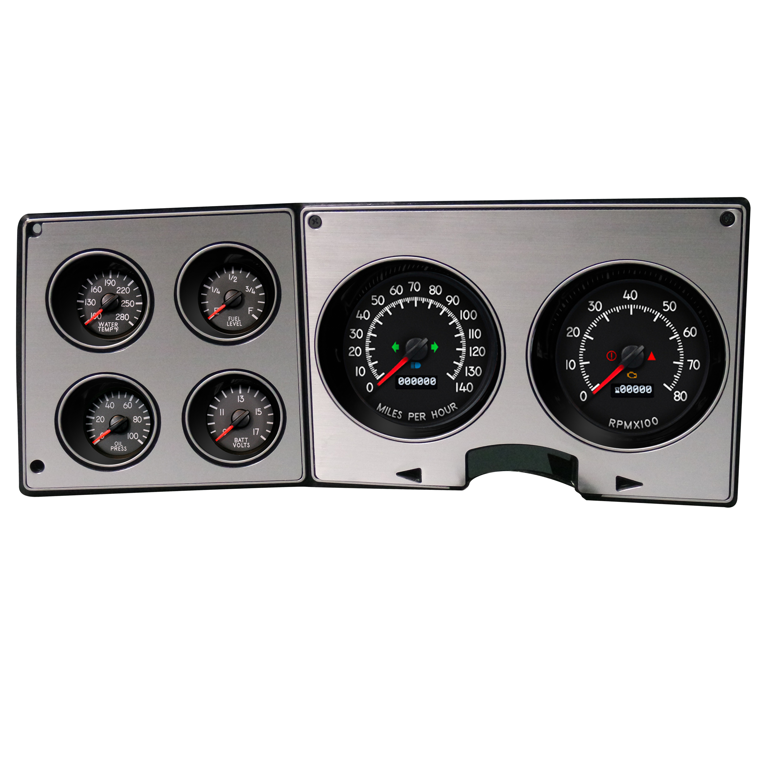 Kits include NVU exclusive mounting bracket and hardware, 4-3/8" programmable speedometer, 4-3/8" programmable tachometer operates on any cylinder configuration, 2-1/16" oil pressure, water temperature, volt and 0-90 fuel gauge. (0-90 ohm factory match fuel gauge utilizes stock sender-not included). Sender bushings, jumper wiring harnesses where required and programming button.