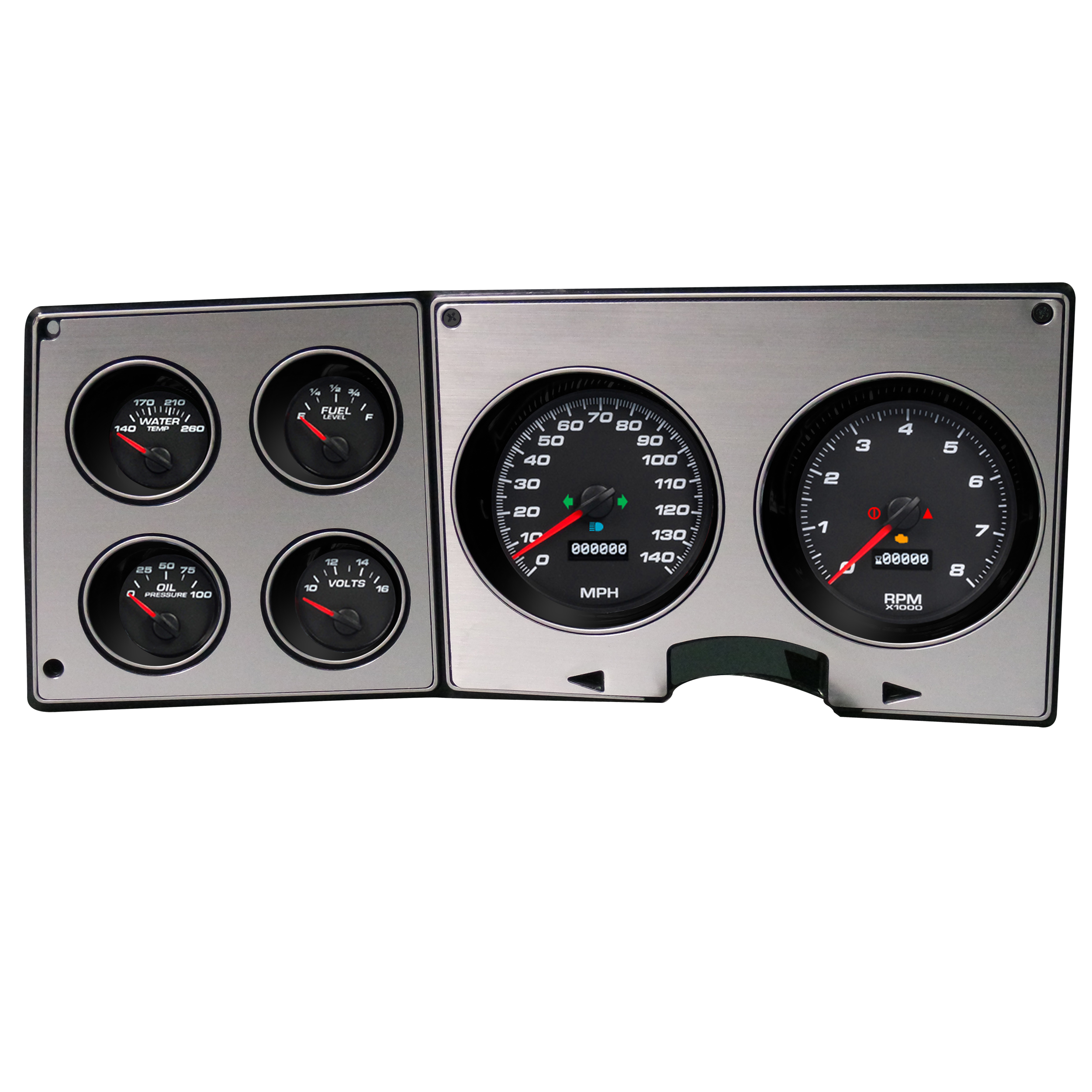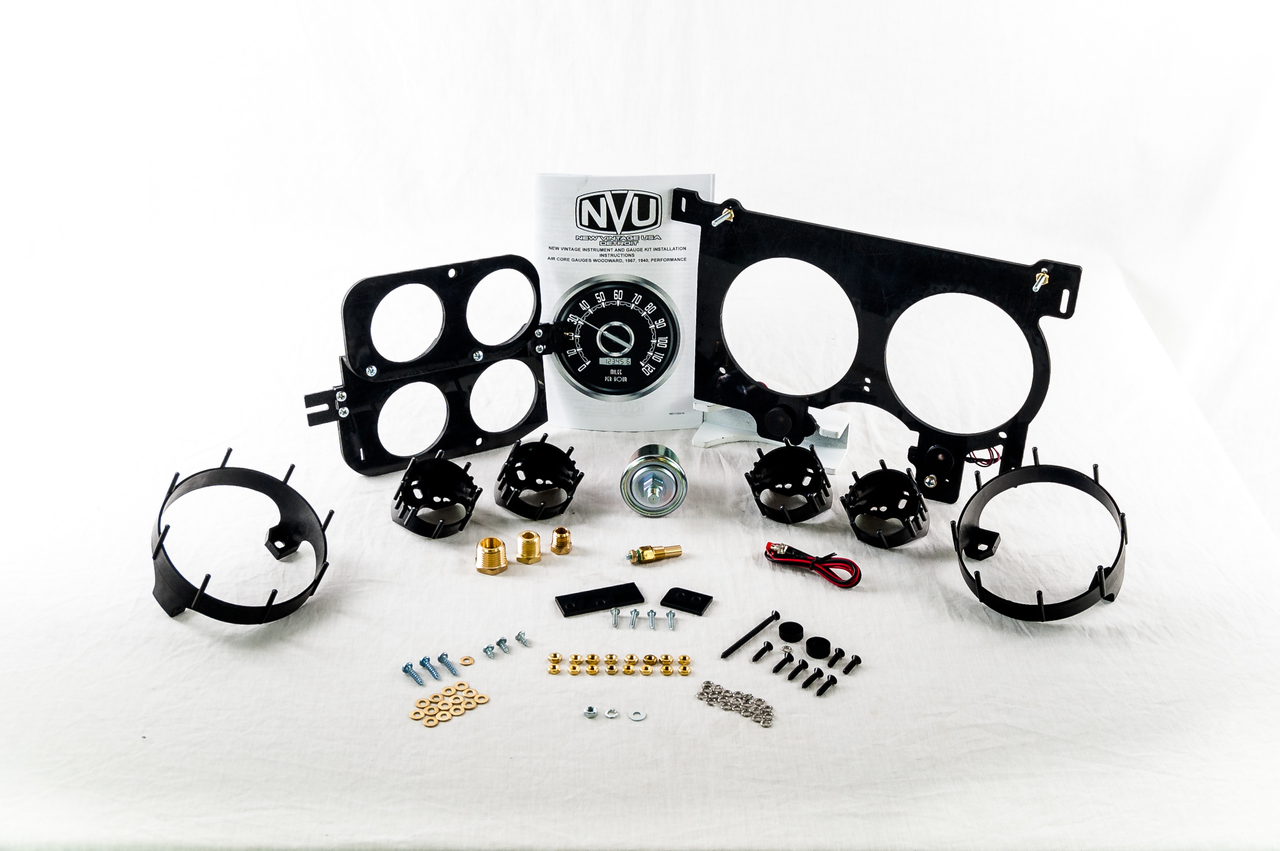Kit include NVU exclusive mounting bracket and hardware, 4-3/8" programmable speedometer, 4-3/8" programmable tachometer operates on any cylinder configuration, 2-1/16" oil pressure, water temperature, volt and 0-90 fuel gauge. (0-90 ohm factory match fuel gauge utilizes stock sender-not included). Sender bushings, jumper wiring harnesses where required and programming button.