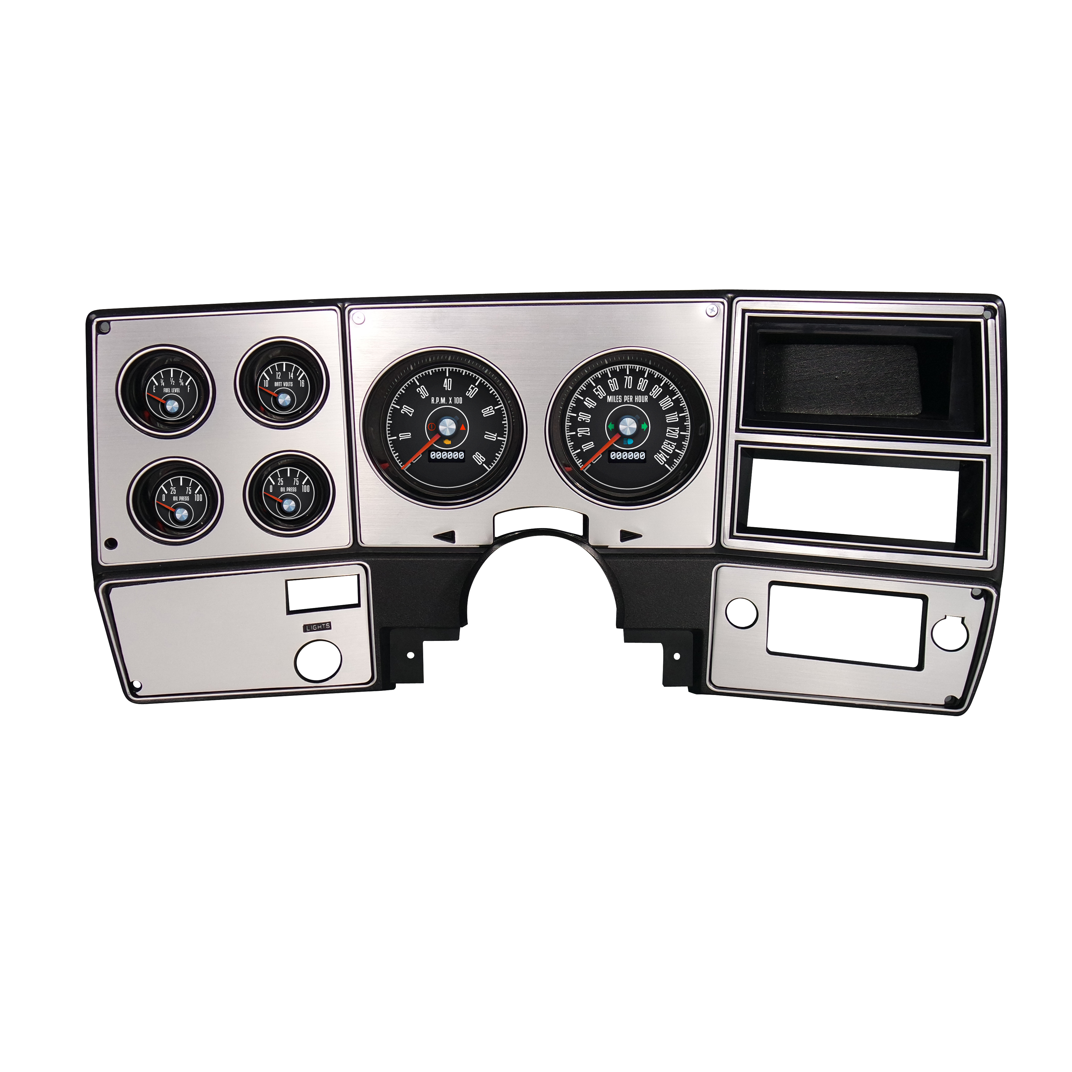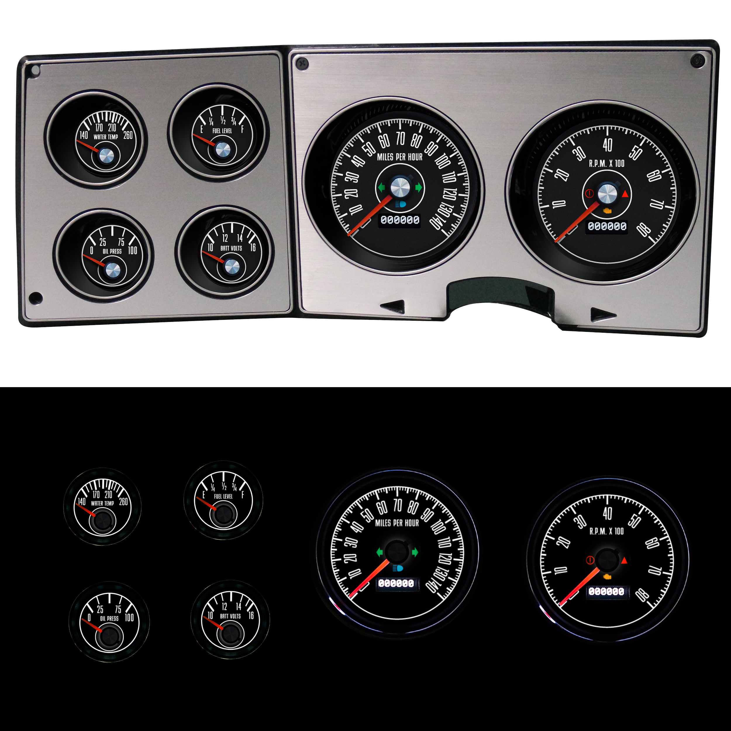 Kits include NVU exclusive mounting bracket and hardware, 4-3/8" programmable speedometer, 4-3/8" programmable tachometer operates on any cylinder configuration, 2-1/16" oil pressure, water temperature, volt and 0-90 fuel gauge. (0-90 ohm factory match fuel gauge utilizes stock sender-not included). Sender bushings, jumper wiring harnesses where required and programming button.