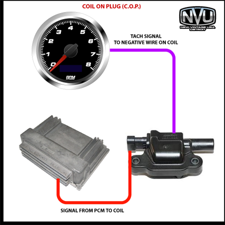 In most popular setups you will be able to take the tach signal directly from the PCM. In those instances where you cannot, the signal can be picked up from the negative side of the coil. This is essentially reading one cylinder at a time so the tach should be set up for a one-cylinder engine. The PCM actually acts as the distributor for COP (Coil on Plug) systems.