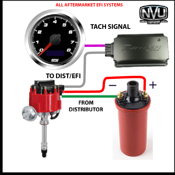 Every aftermarket EFI system has a dedicated tach output. The EFI works in conjunction with the distributor to control fuel and to some extent ignition. Consult your EFI manufacturer's instructions for connection point, wire color and pulse settings (#of cylinders). This is usually a hall effect signal which is no problem for NVU tachs, we have 1000s running on all sorts of systems.