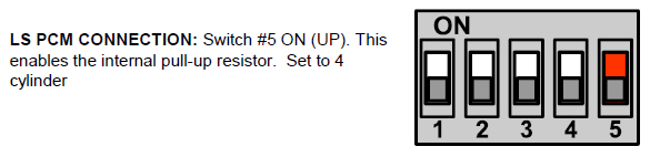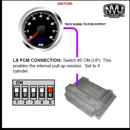 All NVU tachometers can read from any GM PCM with the 5th DIP switch ON (UP) This is our internal pull-up resistor and no additional pull-up is required. All GM PCMs regardless of the number of cylinders, gas or diesel, output a 4 cylinder open collector signal. For a more in-depth discussion take a look at our Interfacing with GM PCMs article.