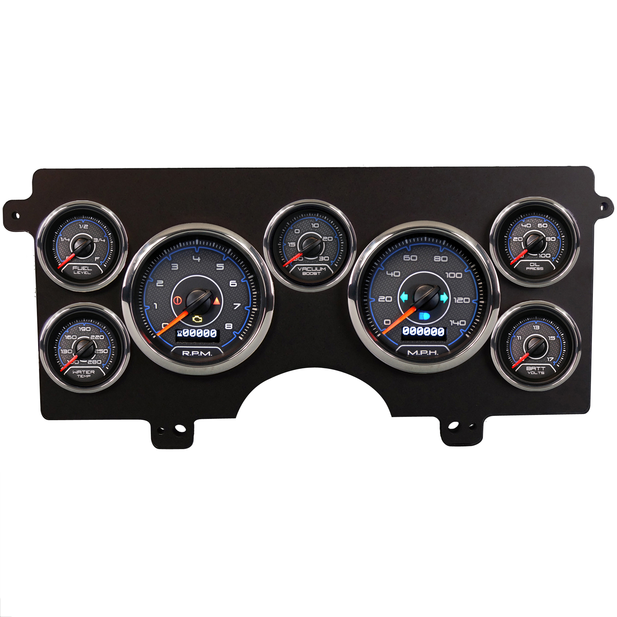 CFR series instruments bring a new level of design, technology and features to the aftermarket. Exotic muscle graphics incorporating textures and colors in a way that says high-class, high tech and performance all at the same time. Textured inner dial with colored accents and bold numbers will make your dash stand out. Great for any resto-mod or pro-touring build. Topped with waterproof lenses and stainless bezels, the CFR series is sure to get your attention while monitoring vital components. Any build that demands exotic, high tech design will set the bar for dash design with the CFR series instruments.