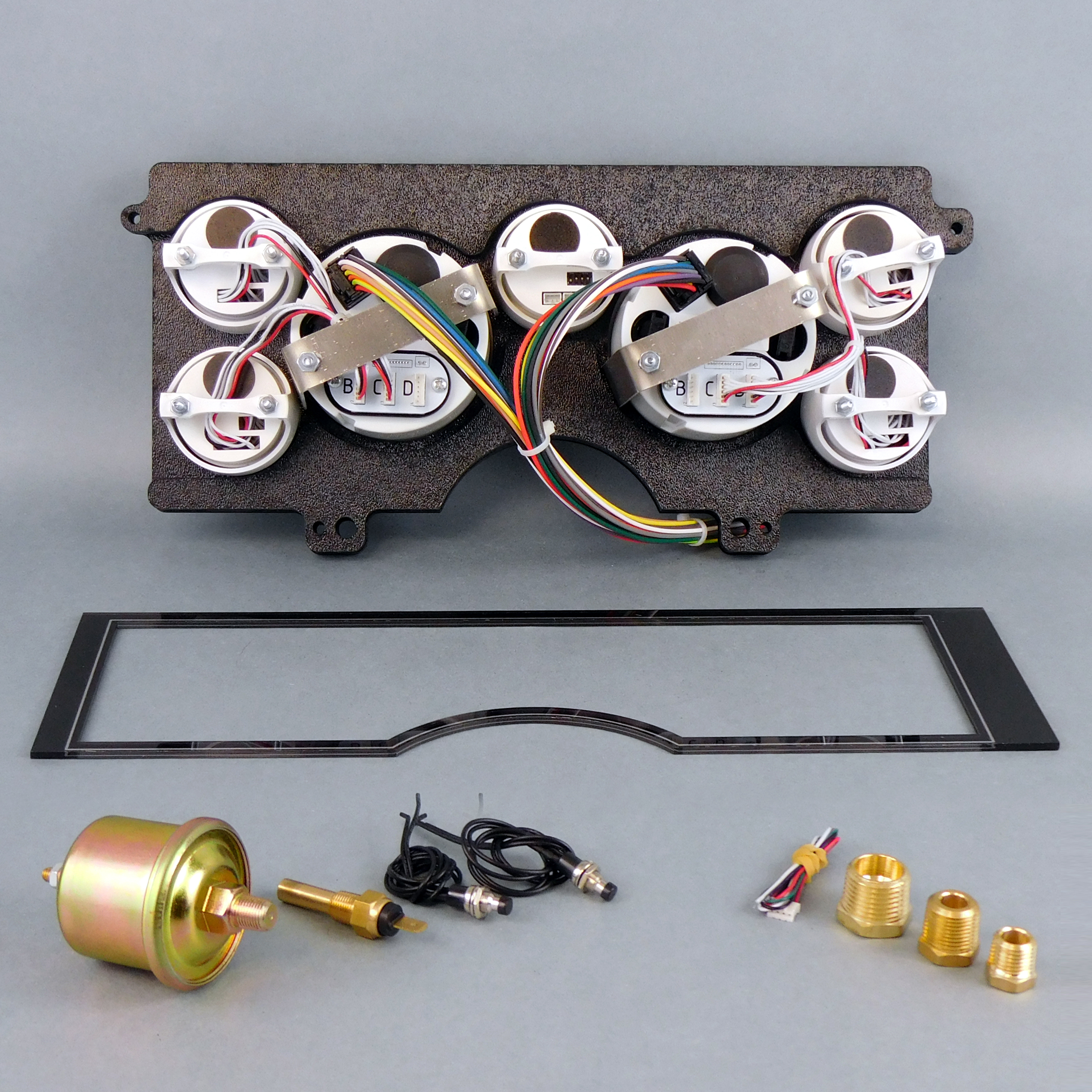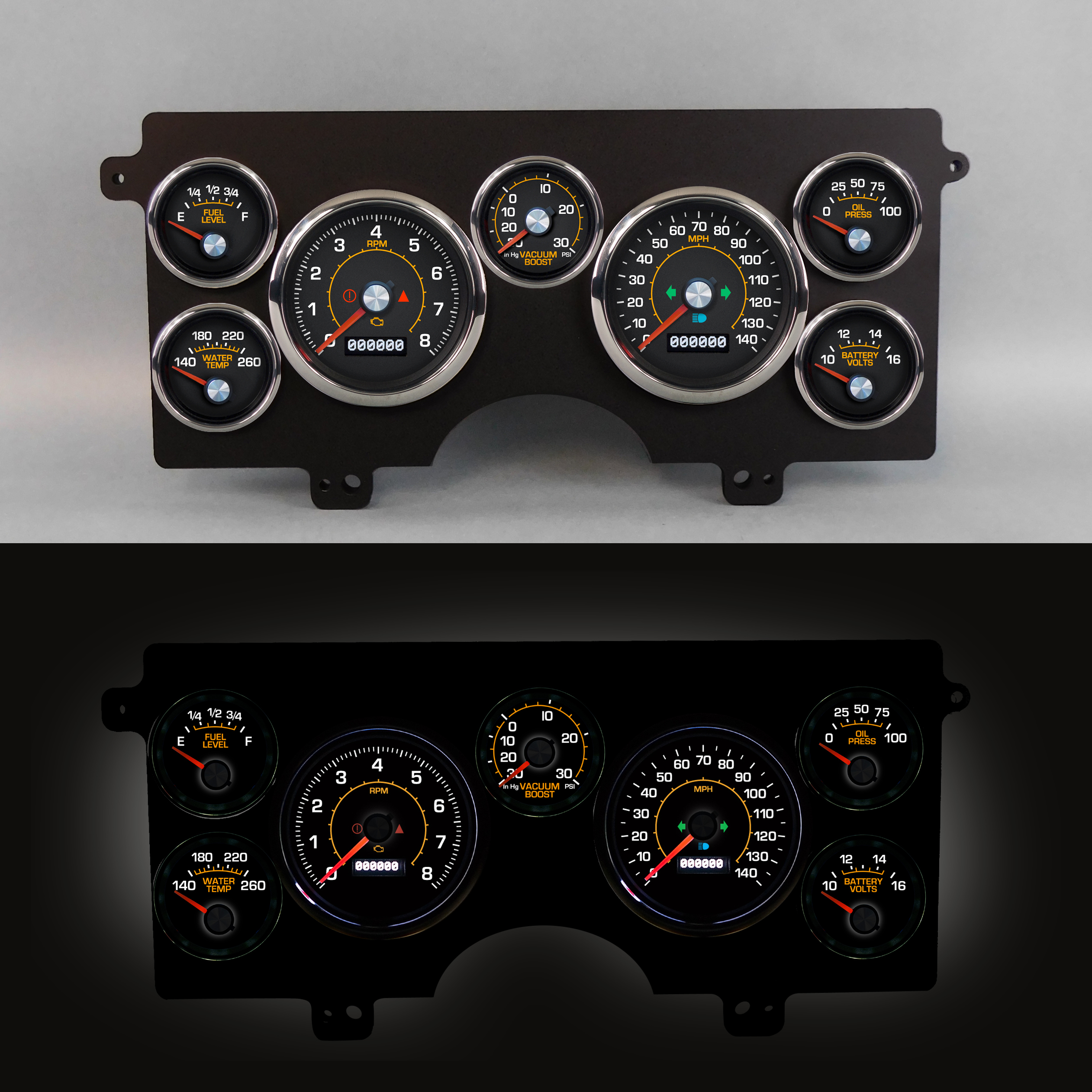 NVU has been building these for years a s a custom, now its finally available as a standard part! Bring your 84-87 Buick Regal/T-Type and Grand National dash to the next level with a complete kit from NVU. Designed to fit similar to the GNX style, the exclusive laminate printed CNC cut bracket bolts to the stock mounting tabs. The printed acrylic trim with black and silver finish adds a touch of class and cleans up any ragged edges left from trimming. (trimming of stock bezel required, see instructions). NVU also included deadfronted (now you see it, now you don't) turn signals, hi beam and warning lamps to the panel for a clean, professional look. Kits include matching vacuum/boost gauge to monitor the turbo.