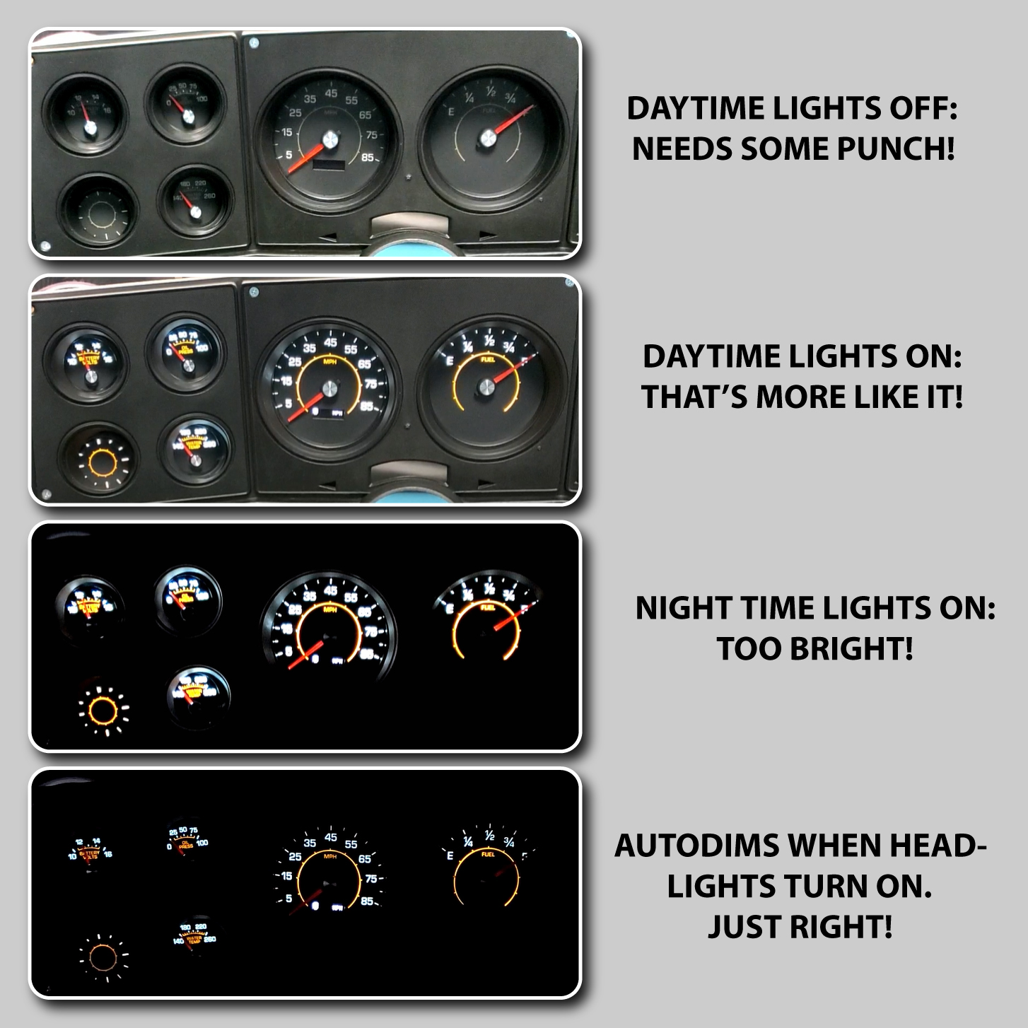 Its the feature you never knew you needed until now! We've found over the decades of installing aftermarket gauges can present visibility issues during the day. The gauges are sometimes recessed deep in the dash or in a shadow making them hard to see. NVU's AutoDimmer can be configured to turn on the lights with the ignition key on and automatically dim them when the lights are activated. This brings higher visibility and brighter colors to the day view and then dimes to your pre-selected level at night when the lights are on.