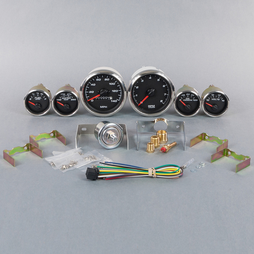 Performance style instruments add an updated race-inspired look while being right at home in most any high-performance or restomod build. Bold graphics are clean and easy to read with bright red performance pointers. Flat real glass lenses and stainless bezels finish off the look. Incandescent perimeter lighting is dim-able using the stock dimmer switch.